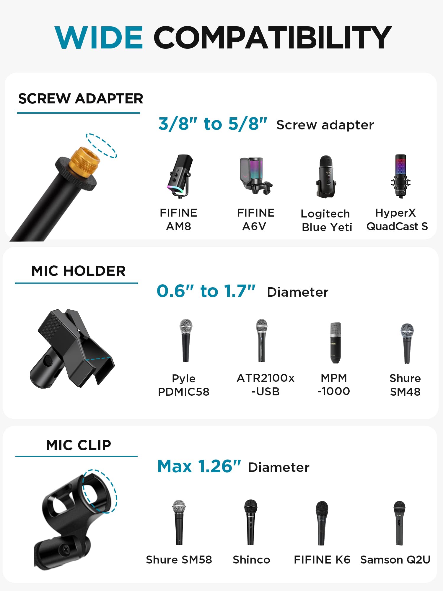 • Wide Compatibility: Two different styles of mic clips in package are compatible with most types of microphones such as Shure SM58, Shure SM48, Shure PGA48, Samson Q2U, ATR2100x-USB, etc. The included metal 3/8” to 5/8” screw adapter is suitable for Blue Yeti, Snowball, Hyper X QuadCast, SoloCast, Shure SM7B, AT2020, Fifine AM8 and more.