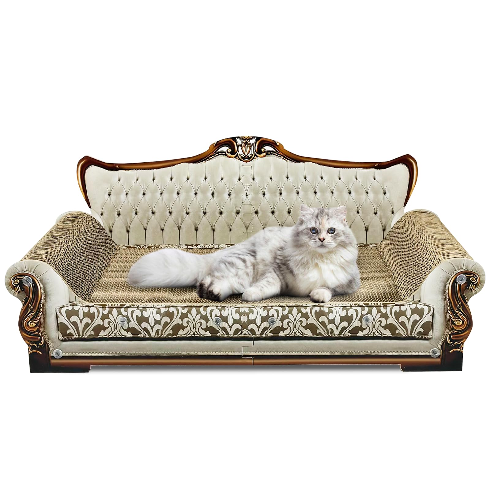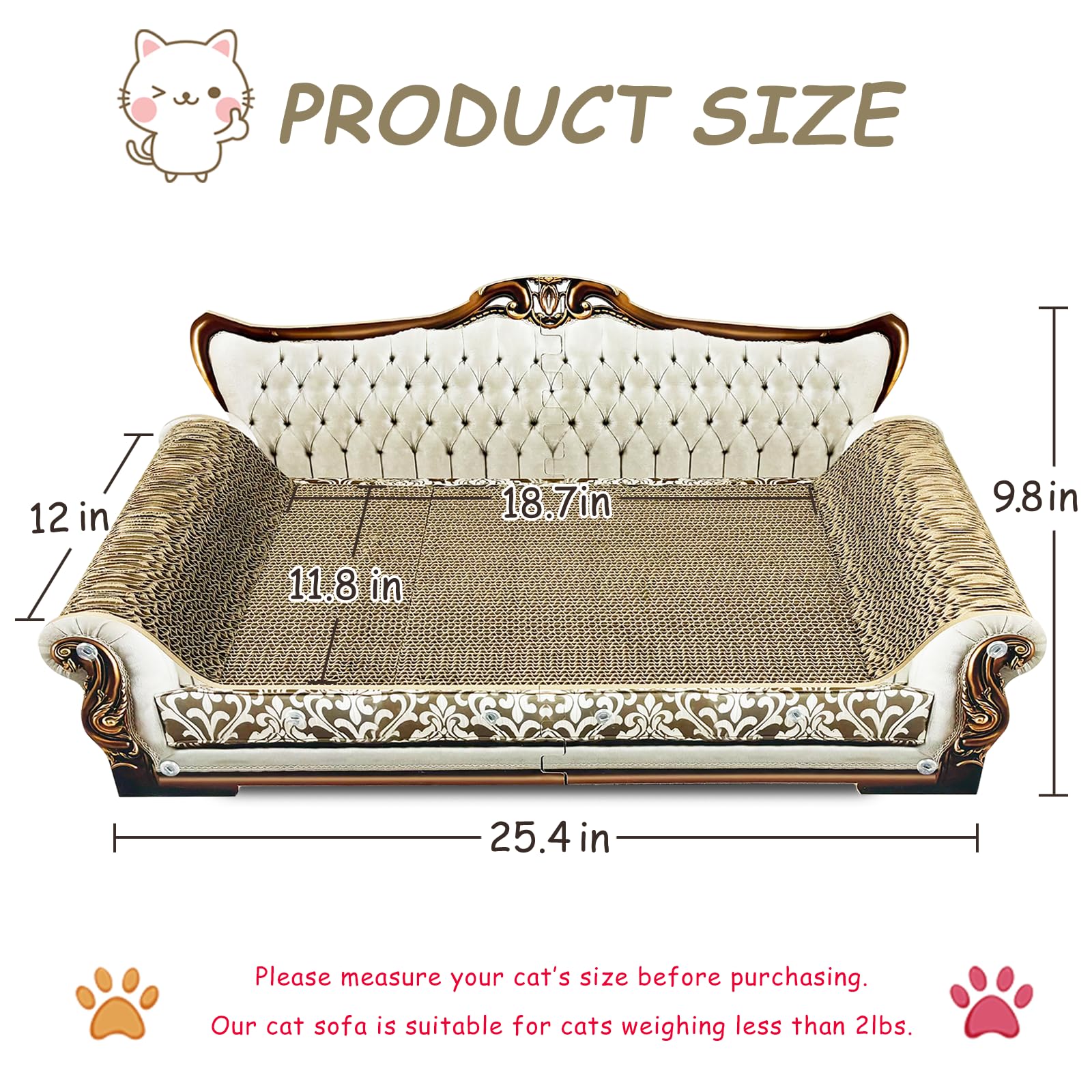 • Lovely & Luxurious Cat Scratcher Sofa: Perfect for small, medium and large cats weighing less than 22 lbs. Give your cat royal experience. The cat sofa's dimensions: 25.4” L * 12” W * 9.8” H (check picture for right size reference)