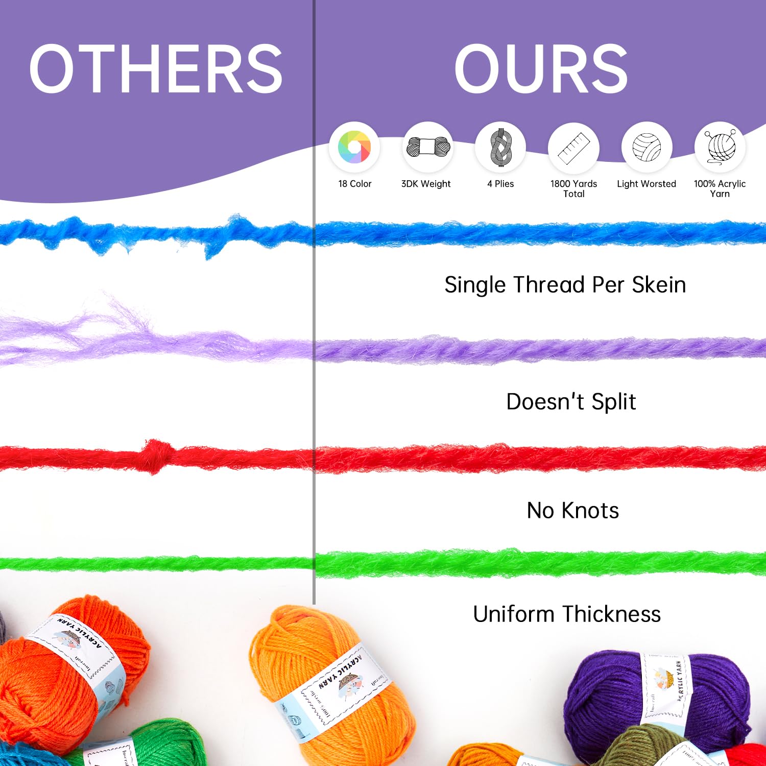 • 【30 Assorted colors & 1650 Yards 】This 100% acrylic yarn pack contains 30 colors, bright and lustrous, no duplicates. A ball of acrylic yarn weighs 36g and the length is about 55 yards, this size is bigger than most other sets on Amazon.