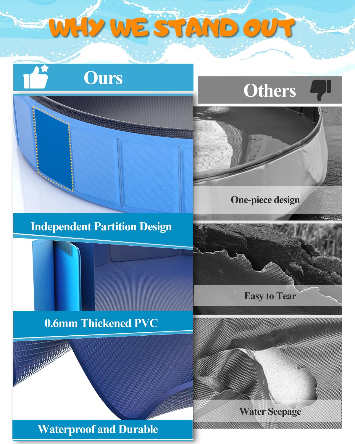 • Reinforced Baffle Design: Each section of the large dog pool functions independently, so if one panel gets punctured, the rest of the dog pool stays firm—no collapsing, no messy water overflow, makes it an ideal dog bathtub for large dogs who love to jump, run, and splash around. Whether you’re using it as a backyard dog bathtub or travel-ready pool, the sturdy build ensures reliable, long-lasting fun.