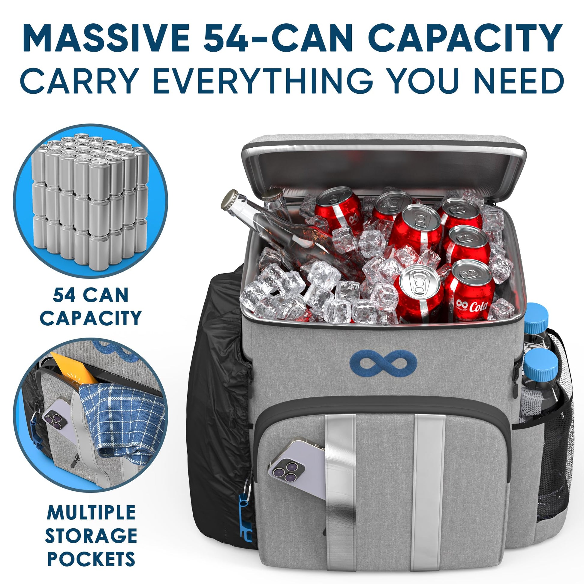 • DURABLE AND SPACIOUS INTERIOR: Our insulated backpack cooler can hold up to 54 cans, offering more storage than other cooler backpacks. Features a leakproof liner and waterproof zippers to ensure durability