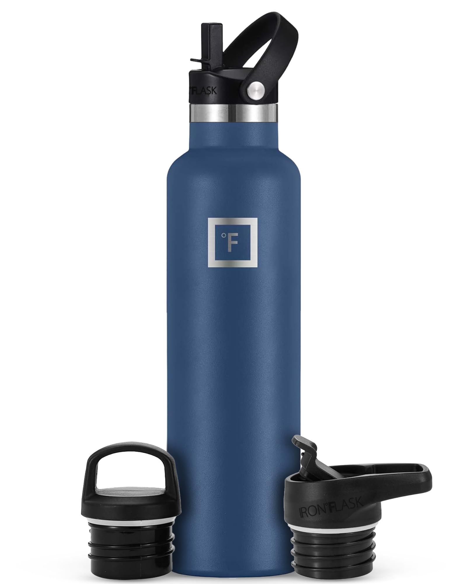 IRON °FLASK Camping & Hiking Hydration Canteens - 3 Lids (Narrow Straw Lid) Leak Proof Vacuum Insulated Stainless Steel - Hot & Cold Double Walled Sports Water Bottle - Twilight Blue, 24 Oz