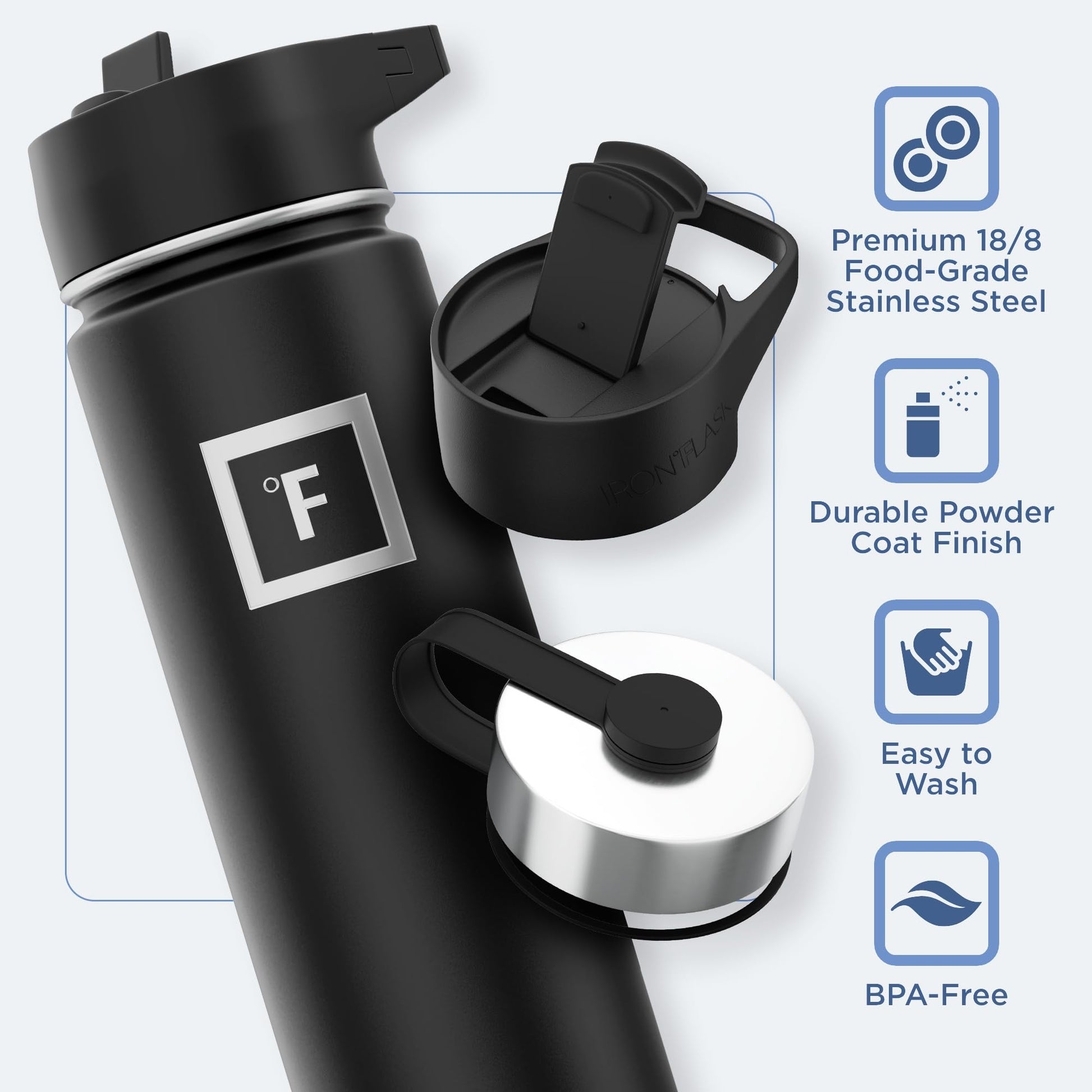 IRON °FLASK Camping & Hiking Hydration Flask with 3 Lids - Stainless Steel, Double Walled & Vacuum Insulated Water Bottle - Leak Proof & BPA Free (Midnight Black, Straw - 22 oz)