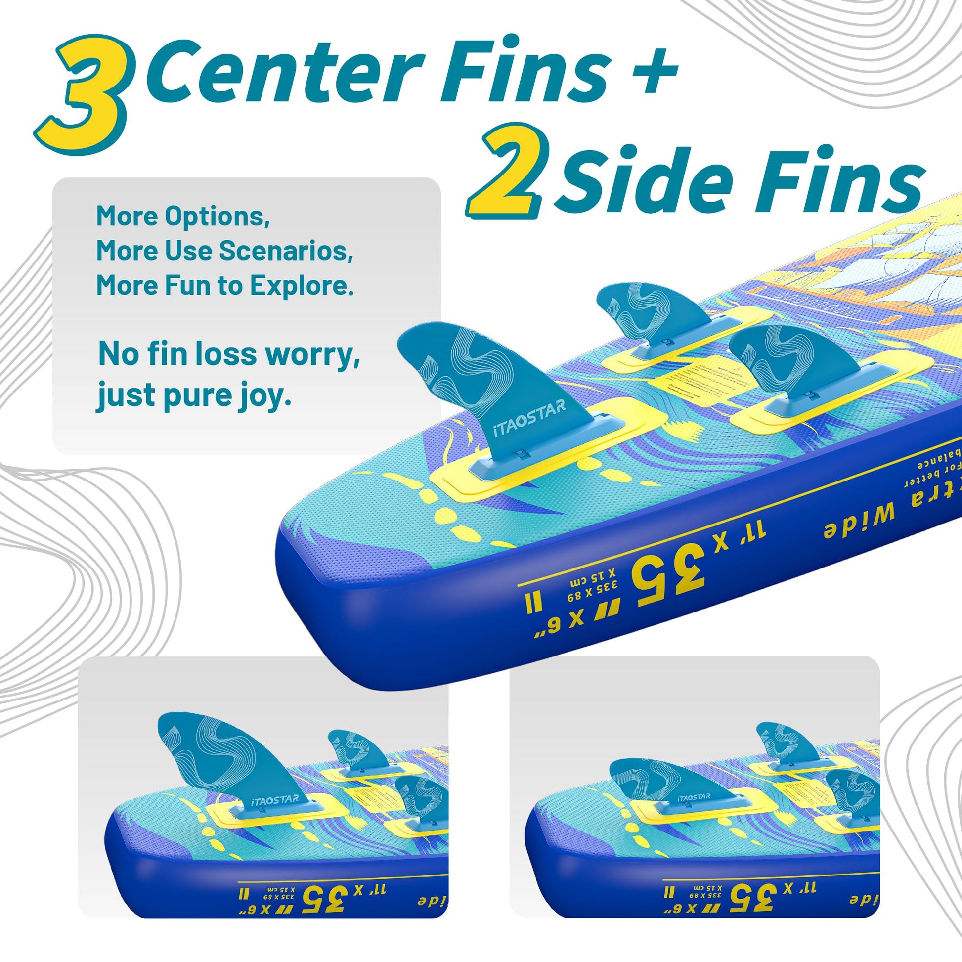 • More Fun - Exclusively from iTAOSTAR, our five tailored fins (3 central + 2 side fins) adapt to various scenrios, offering diverse balance and zero fin-loss worries. Dive into personalized paddleboarding fun without limits