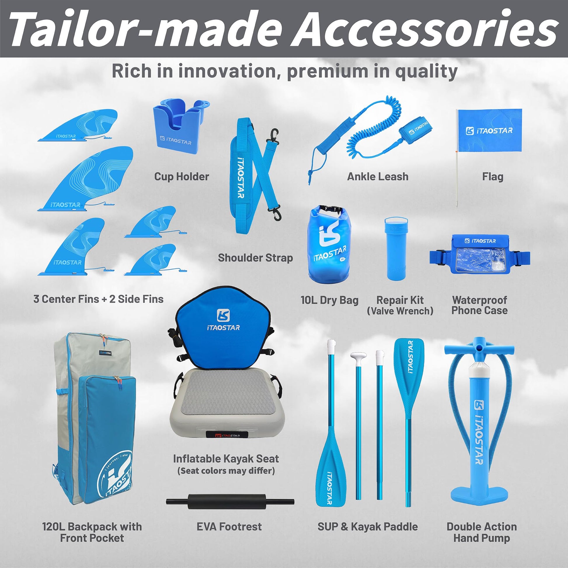 • Tailored One-Stop Accessories - Our iSUP set features more stuff than others, which include an adjustable paddle with kayak kit, 5 fins, seat, footrest, double-action pump, shoulder strap, ankle leash, waterproof pouch, 120L backpack, 10L dry bag, cup holder, flag, valve wrench, and manual