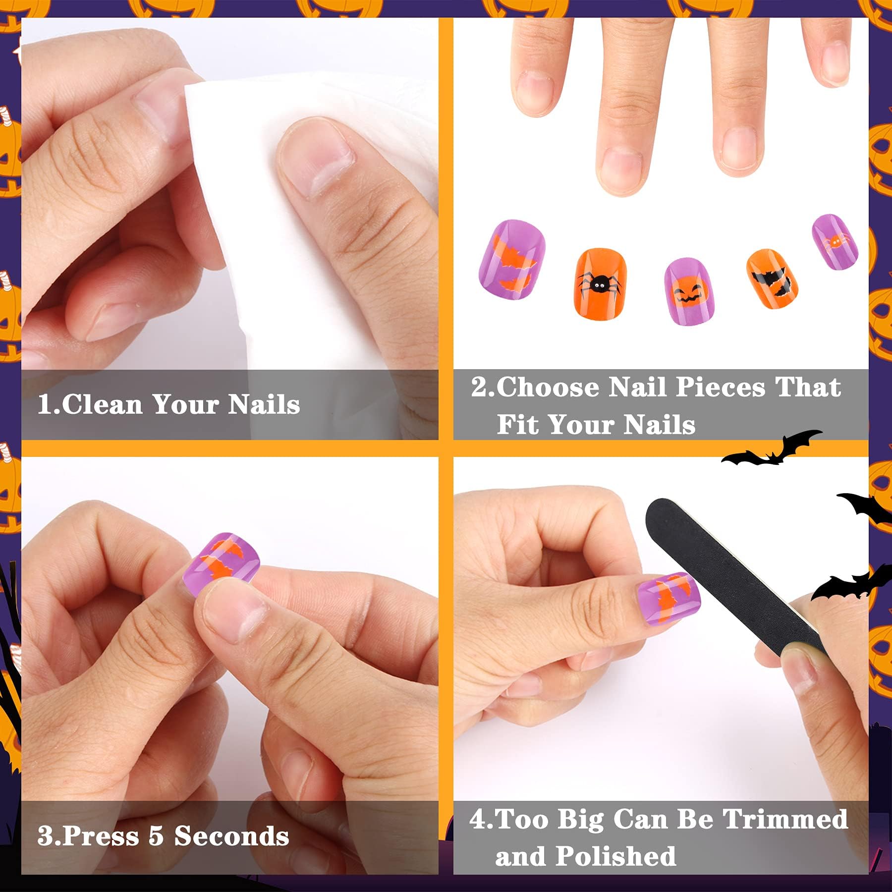 • Halloween Theme - themed fake nails are printed with patterns such as bats, pumpkins, skulls, spiders, and spider webs, which are full of Halloween flavor. Create unique Halloween manicures for your children and let them enjoy the joy of Halloween