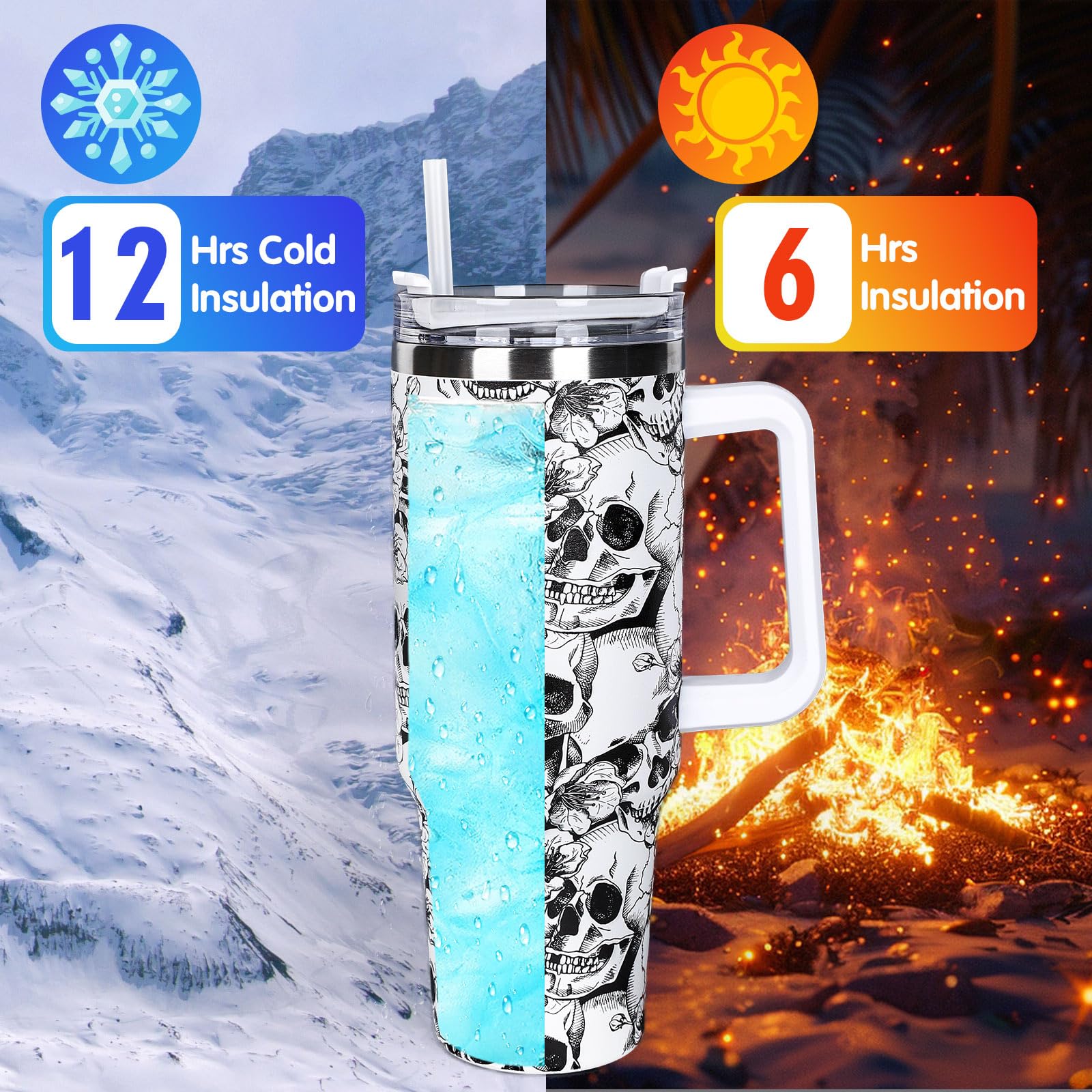 Whaline 40oz Halloween Tumbler with Straw and Lid Skull Travel Coffee Tumbler Cup with Handle for Trick or Treat Birthday Party Gifts