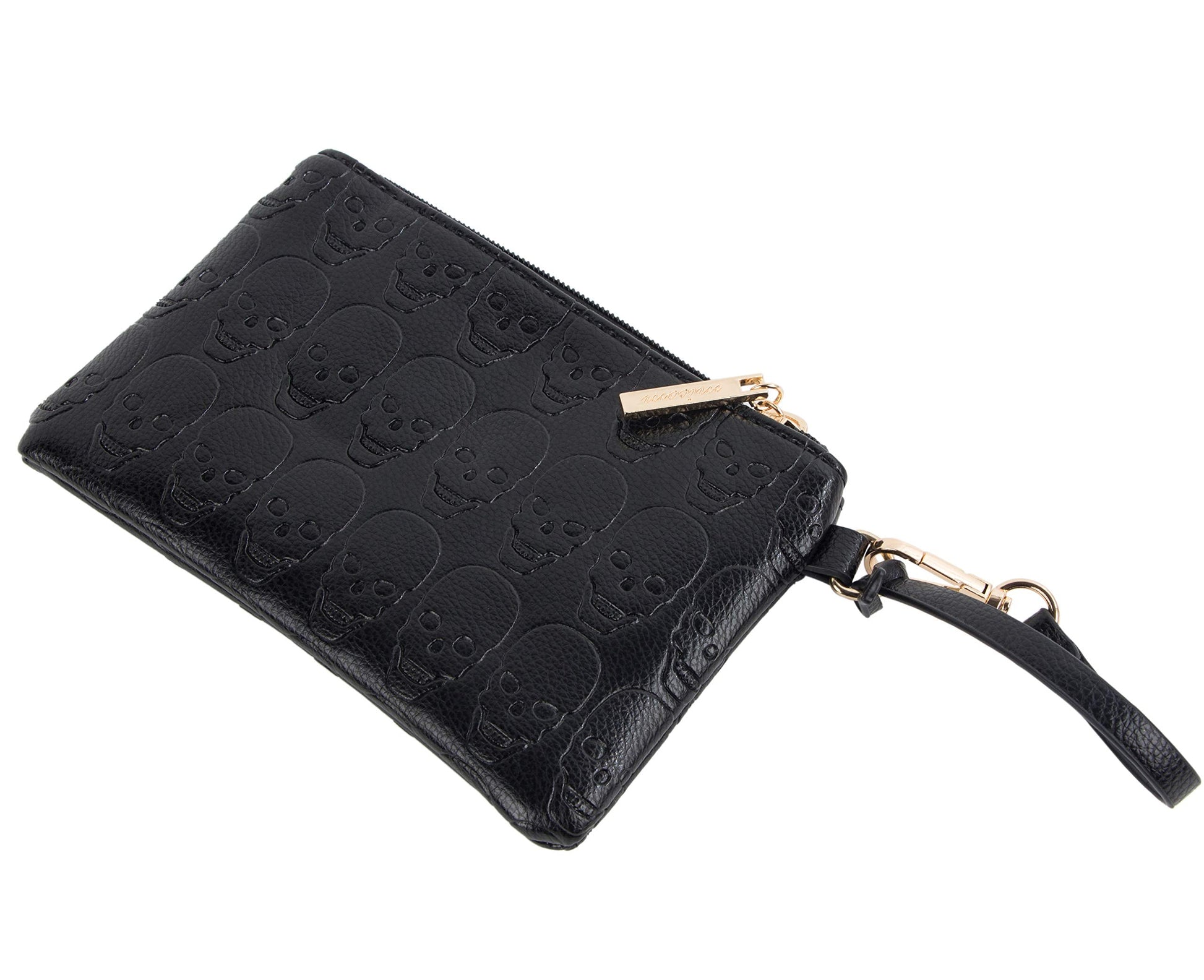 • Stylish combination of cool and cute elements: all over embossed with devil skulls, golden zipper.