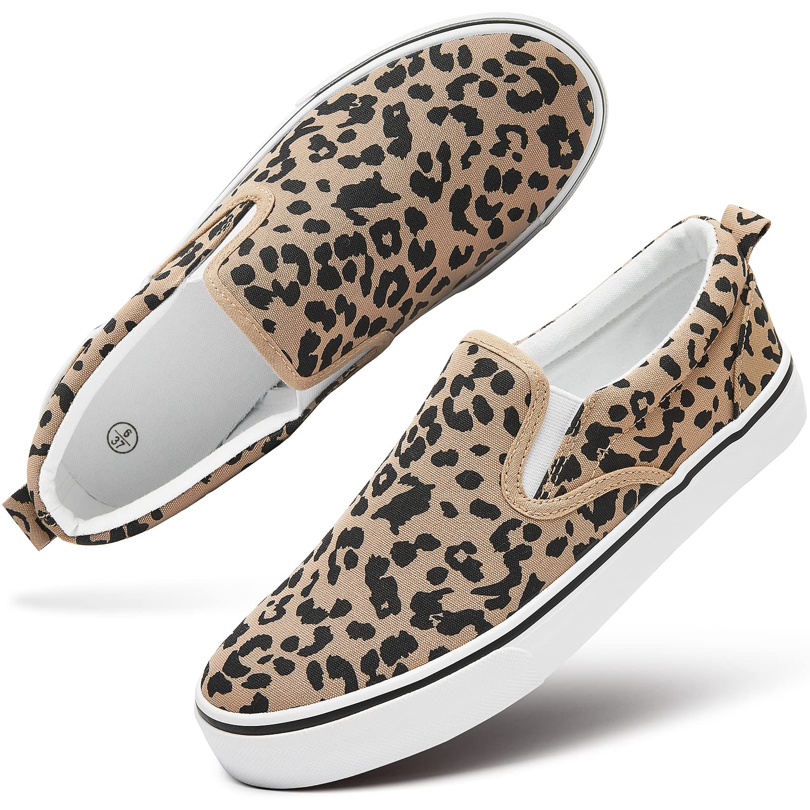 Women's Canvas Slip On Sneakers Fashion Flats Shoes White Canvas Shoes (Leopard, US5.5)
