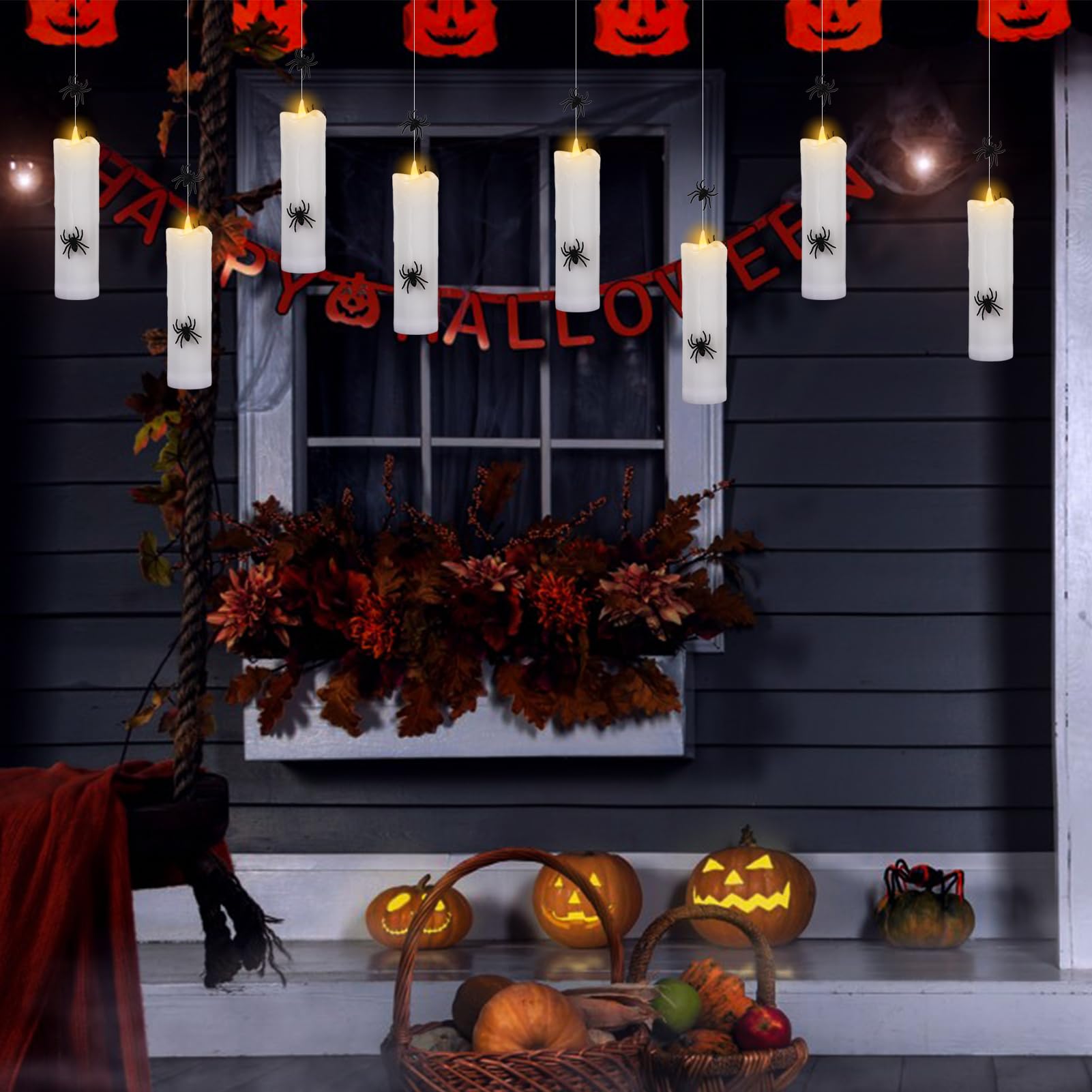 • 3D Spider Halloween Floating Candles: Each candle and fishing line has a 3D spider attached to it, which looks lifelike. The top of the candle simulates the effect of real candle dripping with warm flickering lighting design add more halloween atmosphere for your party or home decoration.