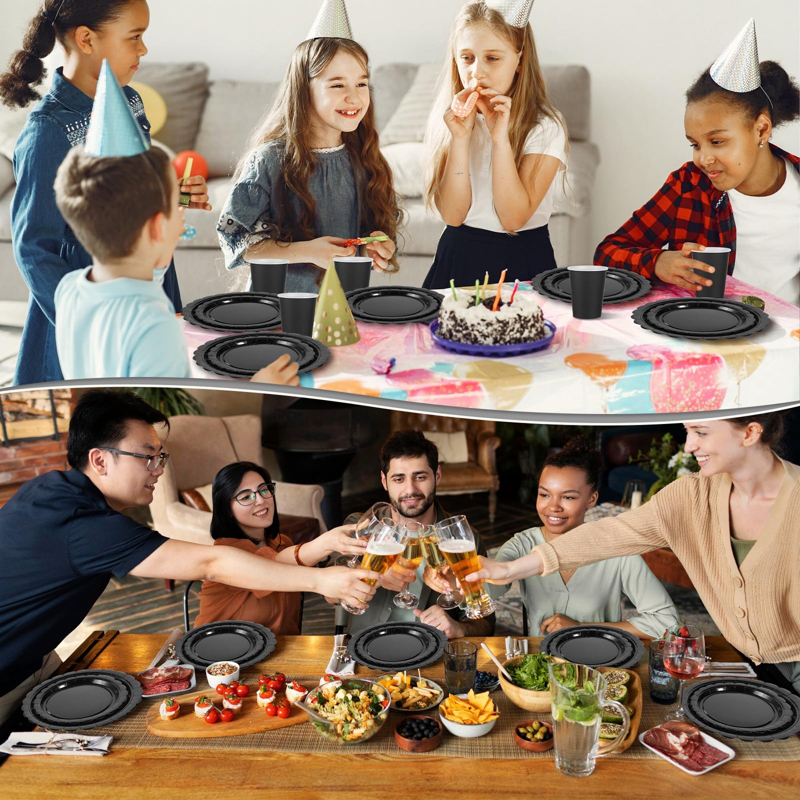 • 175 Pcs Black Party Supplies Set: Includes 25 x 9 inch black paper plates, 25 x 7 inch black dessert plates, 25 x 9 ounce black cups, 25 x 6.5 inch black napkins, 25 plastic forks, 25 knives,25 spoons