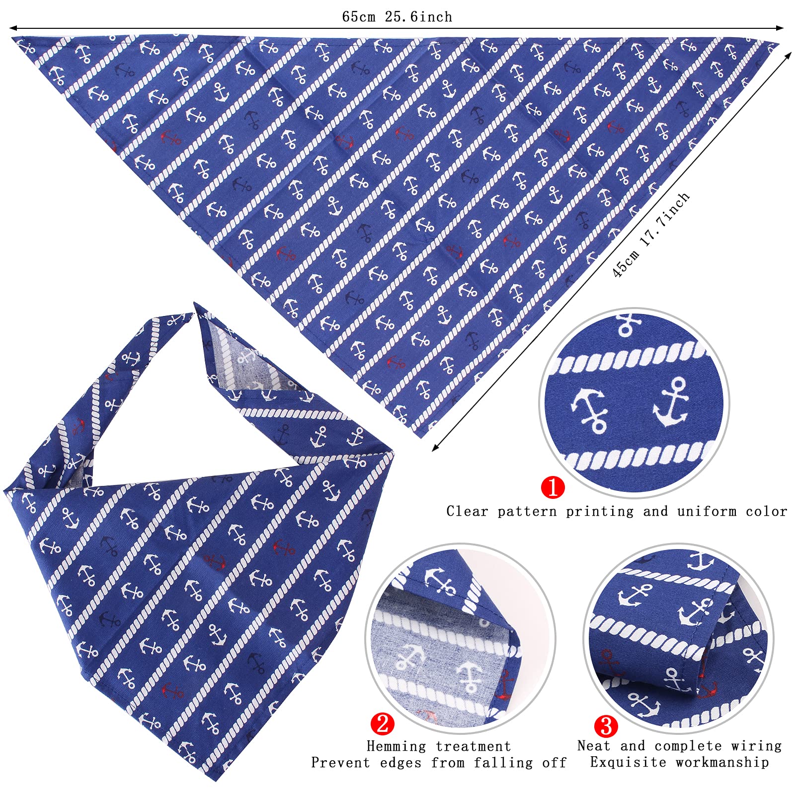 • Pet Anchor Bandana: Made of soft and good quality cotton, natural skin care, lightweight, absorbent and breathable, printed with anchor pattern, also not easy to fade, and can be washable and reusable