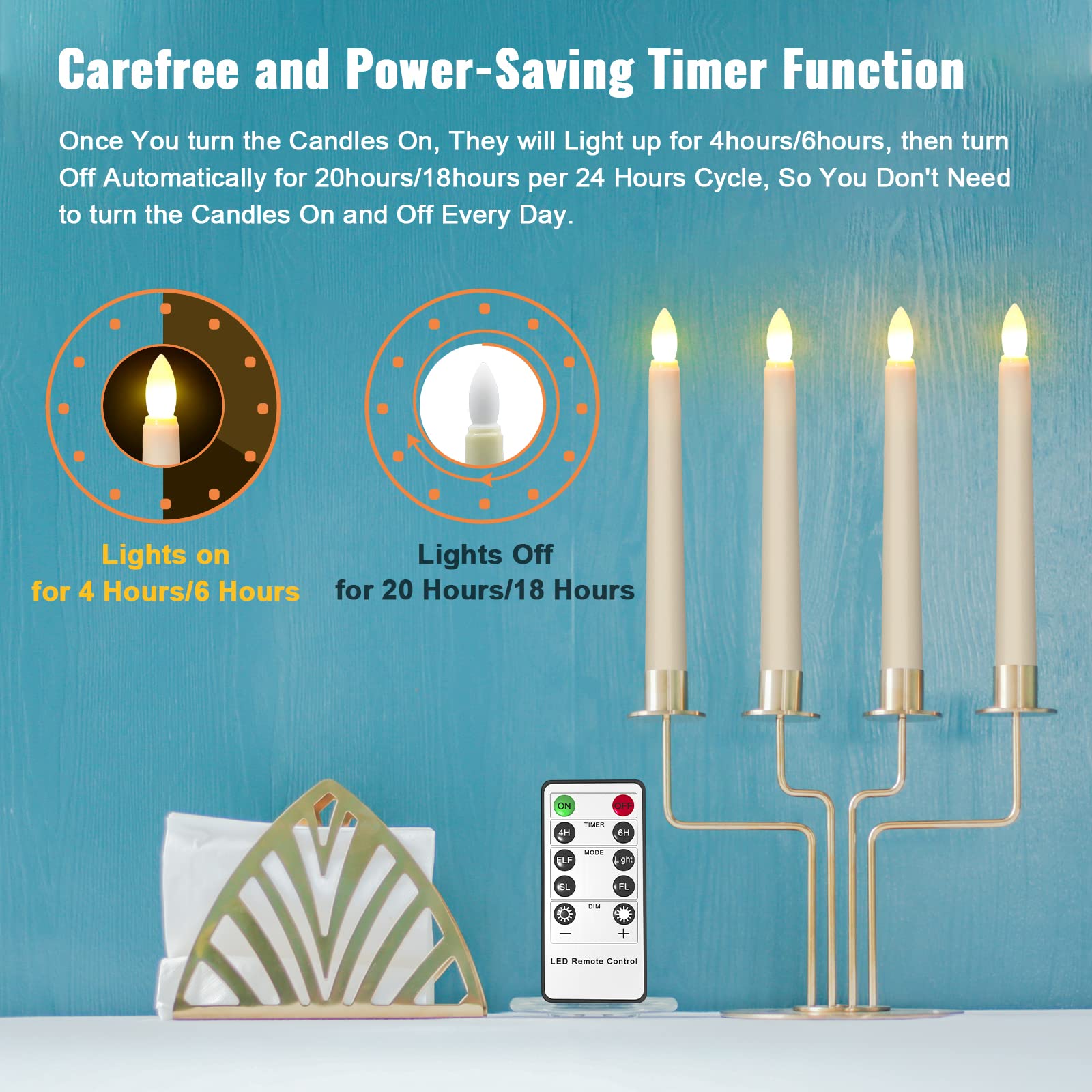 • Remote Controlled LED Candles: Supplied 4 lighting modes and brightness increase or decrease with these taper candles. Convenient to adjust based on different occasions or your preferences. Also, the 4/6H timer allows these candles turn on and off automatically due to the time period you set