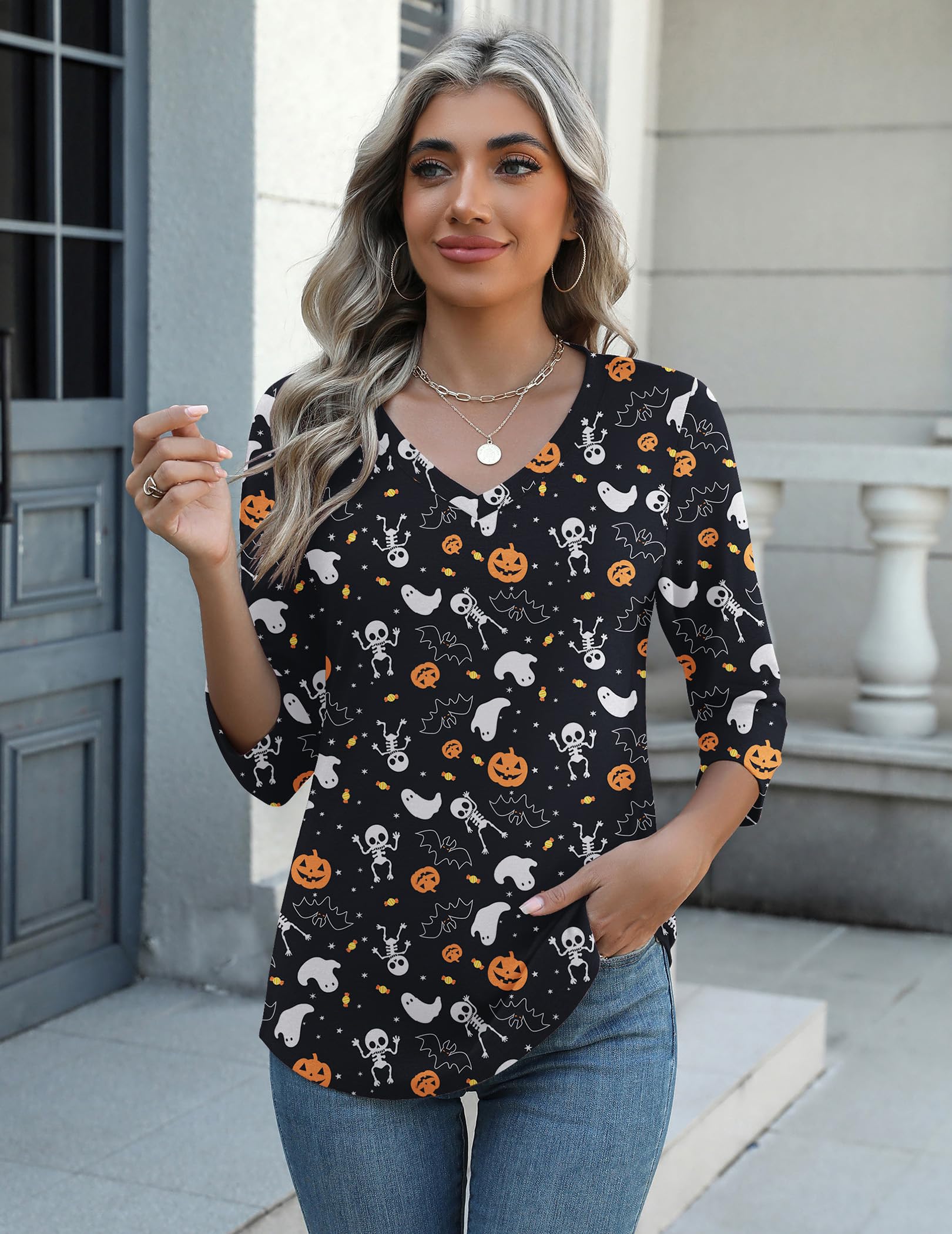Zeagoo Halloween Pumpkin Shirts Women Fall T-Shirts Cute Autumn Graphic Tees Thanksgiving Tops Halloween Shirts 3/4 Sleeve V-Neck T Shirt