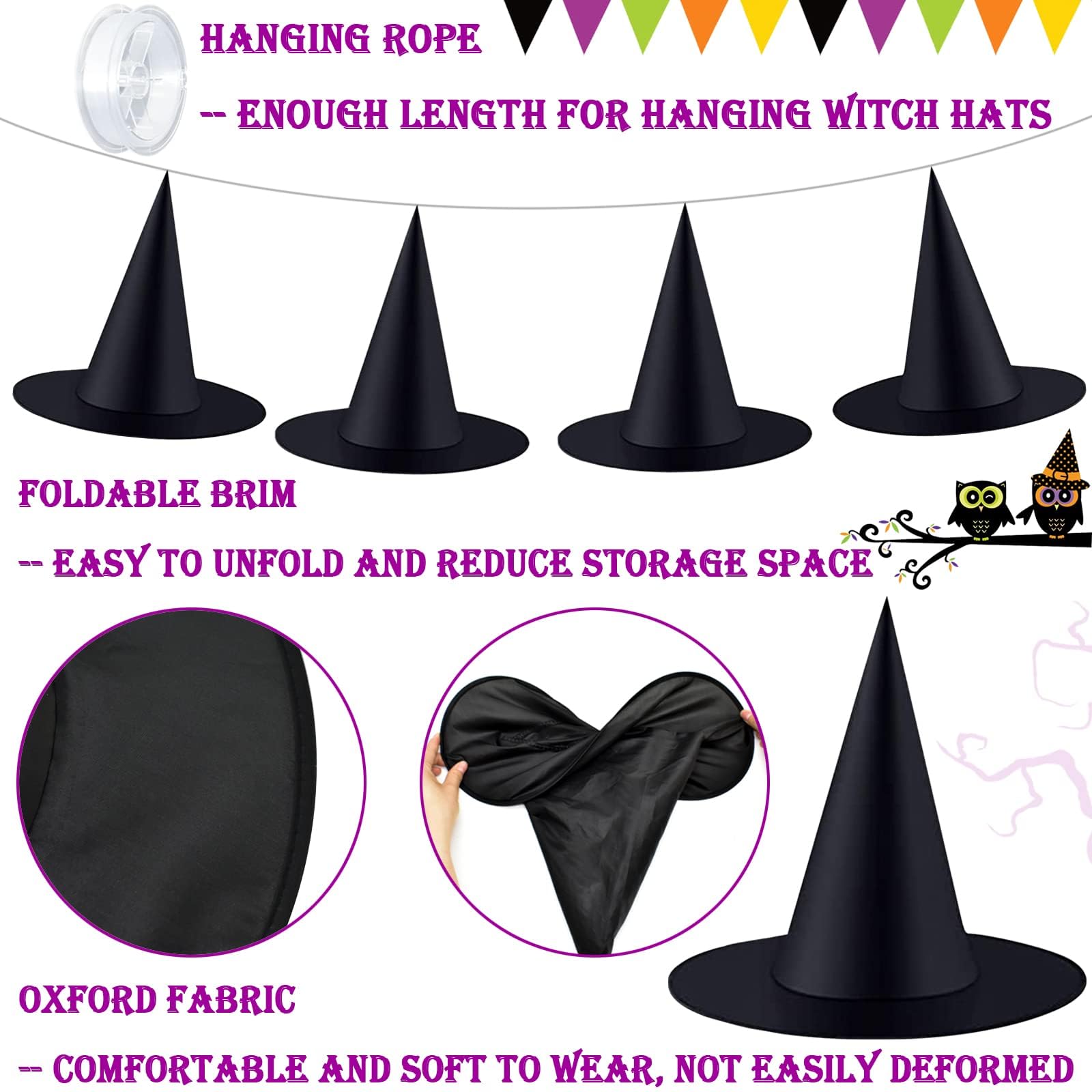 ZeeDix 12 Pcs Halloween Witch Hats, Black Hanging Witches Hat with 98 Ft Hanging Rope, Halloween Costume Accessories Party Decoration