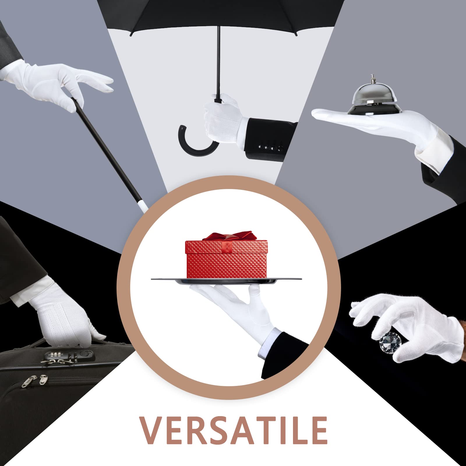 • Versatile: These white cotton gloves are perfect for catering, waiters, santa, parades, doorman, coin jewelry silver inspection, banquet, part outfit and halloween costume etc